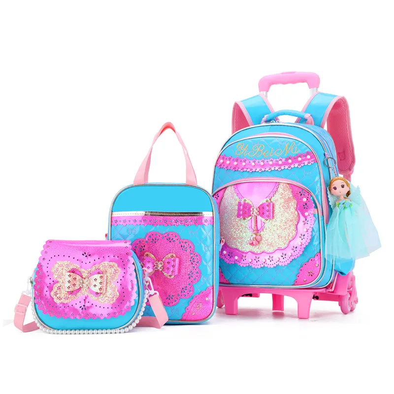 Buy 3Pcs/set Children School Bags Waterproof Girls Purple Princess Trolley Backpack Removable Kids Whee