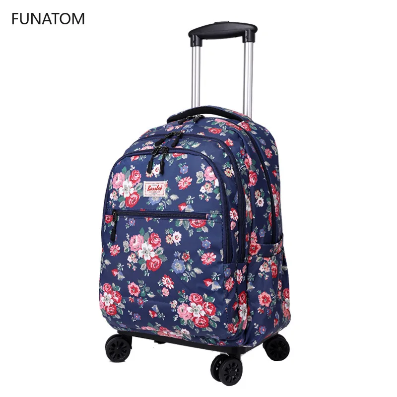 New Women Flower Travel Trolley Bags Travel Luggage Trolley Backpacks Bags with Wheels Oxford Rolling W