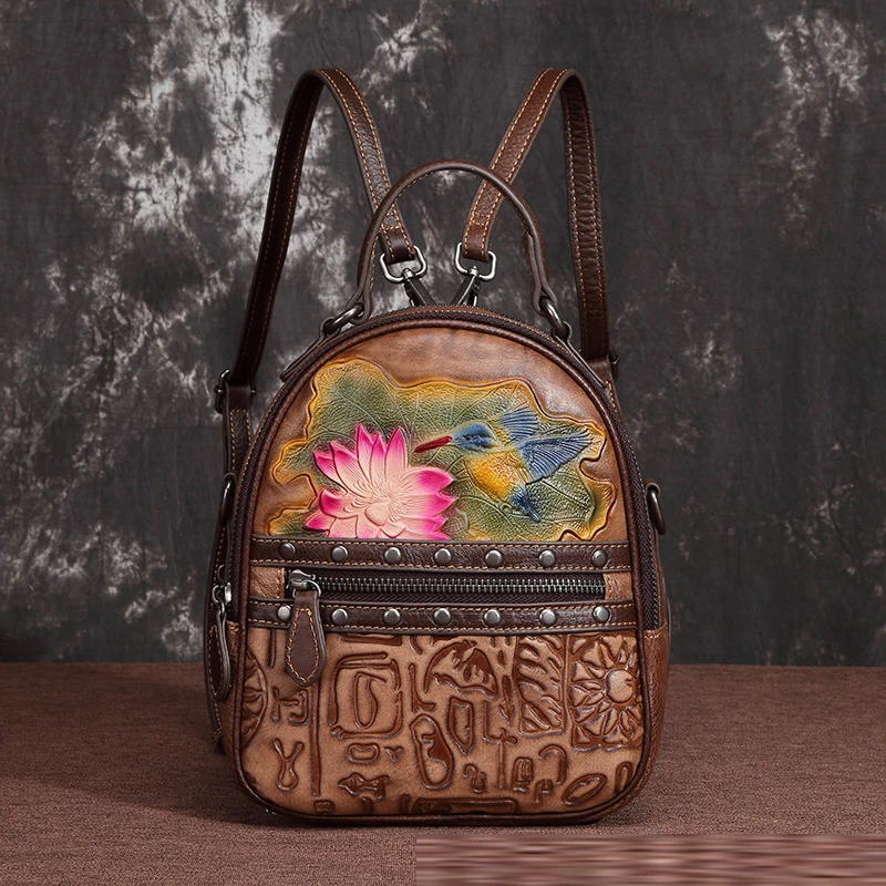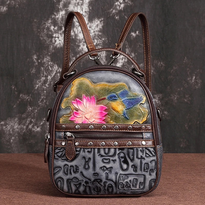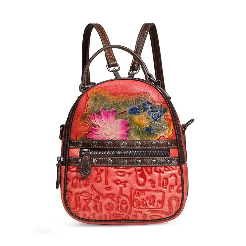 » Hot Product Female Floral Travel Bag Real Cowhide Daypack Rucksack Leisure Designer Small Knapsack Genuine Embo