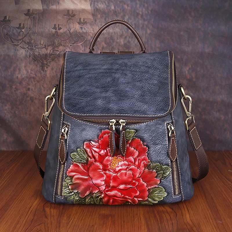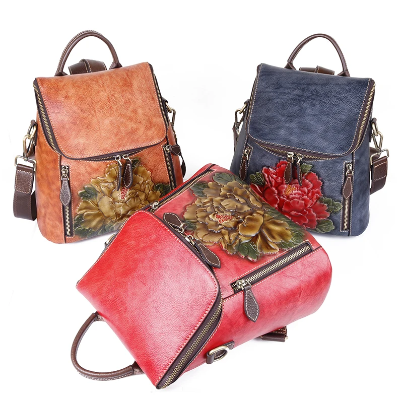 Special Product Cowhide Girls Rucksack Female 3 Use School Daypack Travel Shoulder Bag Knapsack Flower Pattern Wome
